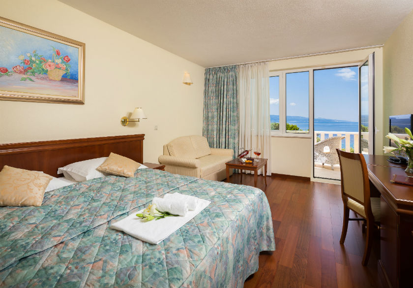 Zimmer 28 m2 mit einem großen Kingsize-Bett und einer ergonomischen Matratze, sowie einem Fußboden aus exotischem Holz mit angenehmen Teppichen, wodurch in der Nebensaison eine natürliche Wärme sichergestellt wird, und während der heißen Sommertage eine angenehme Sommerfrische gesichert wird - ein Ort der Behaglichkeit