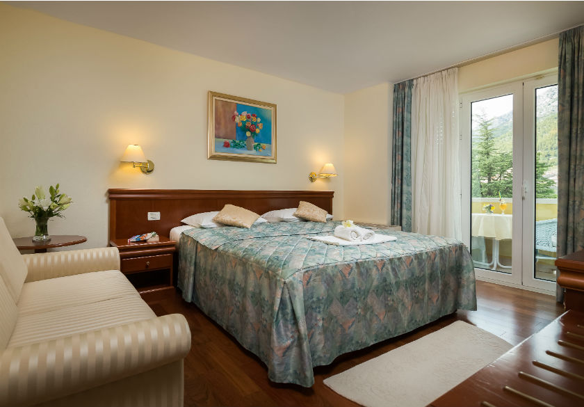 Zimmer 28 m2 mit einem großen Kingsize-Bett und einer ergonomischen Matratze, sowie einem Fußboden aus exotischem Holz mit angenehmen Teppichen, wodurch in der Nebensaison eine natürliche Wärme sichergestellt wird, und während der heißen Sommertage eine angenehme Sommerfrische gesichert wird - ein Ort der Behaglichkeit.